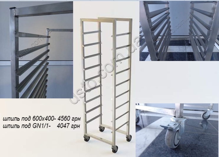 Шпиль из нержавейки относится к нейтральному оборудованию для общепита. В одной конструкции объединились и место для хранения, и средство передвижения. Шпили представляют собой многоуровневые конструкции, оснащенные четырьмя поворотными колесами, два из которых со стопами. В шпили с легкостью закладывается определенное количество подносов или гастроемкостей. Их использование помогает организовать не только пространство на кухне, но и работу поваров. Шпильки достаточно легкие и ими удобно маневрировать по кухне, внутри цеха или по территории предприятия. Чаще всего оборудование выполнено из труб квадратного сечения из нержавеющей стали марки AISI 201.Направляющие из листа имеют отгиб на концах, предотвращающий выпадение емкостей при перемещении шпильки.