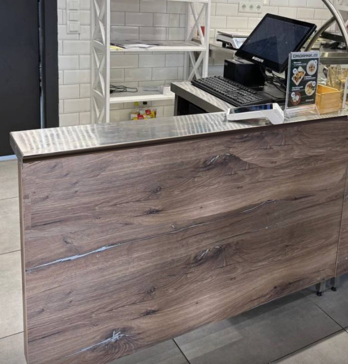 • столешница кассового места выполнена из н/ж стали AISI201 или AISI 304, каркас - из н/ж стали AISI430, лицевая панель - декоративный материал
