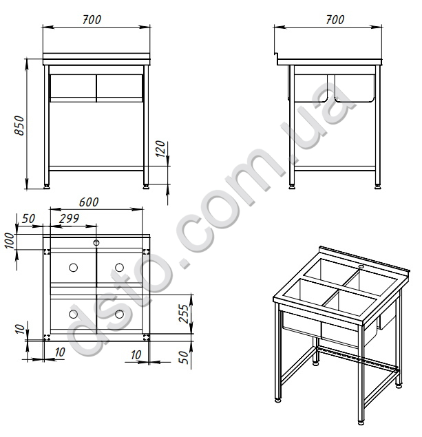 Ванна моечная из нержавейки сварная 1-но секционная (глубина 400 мм) 700х700х850 DS3