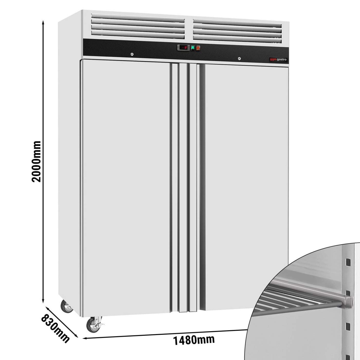 Этот морозильник объемом 1400 литров предназначен для интенсивного и надёжного замораживания продуктов в коммерческих условиях. Он оборудован мощным двигателем, цифровым термостатом и малошумной системой работы, что обеспечивает высокую производительность при низком энергопотреблении. Корпус изготовлен из высококачественной нержавеющей стали AISI 430, что гарантирует долговечность и устойчивость к износу. Конвекционное охлаждение с режимом автоматической оттайки поддерживает равномерную температуру в диапазоне от -15°C до -22°C. Встроенные замки на дверях обеспечивают дополнительную безопасность для сохранности товаров.