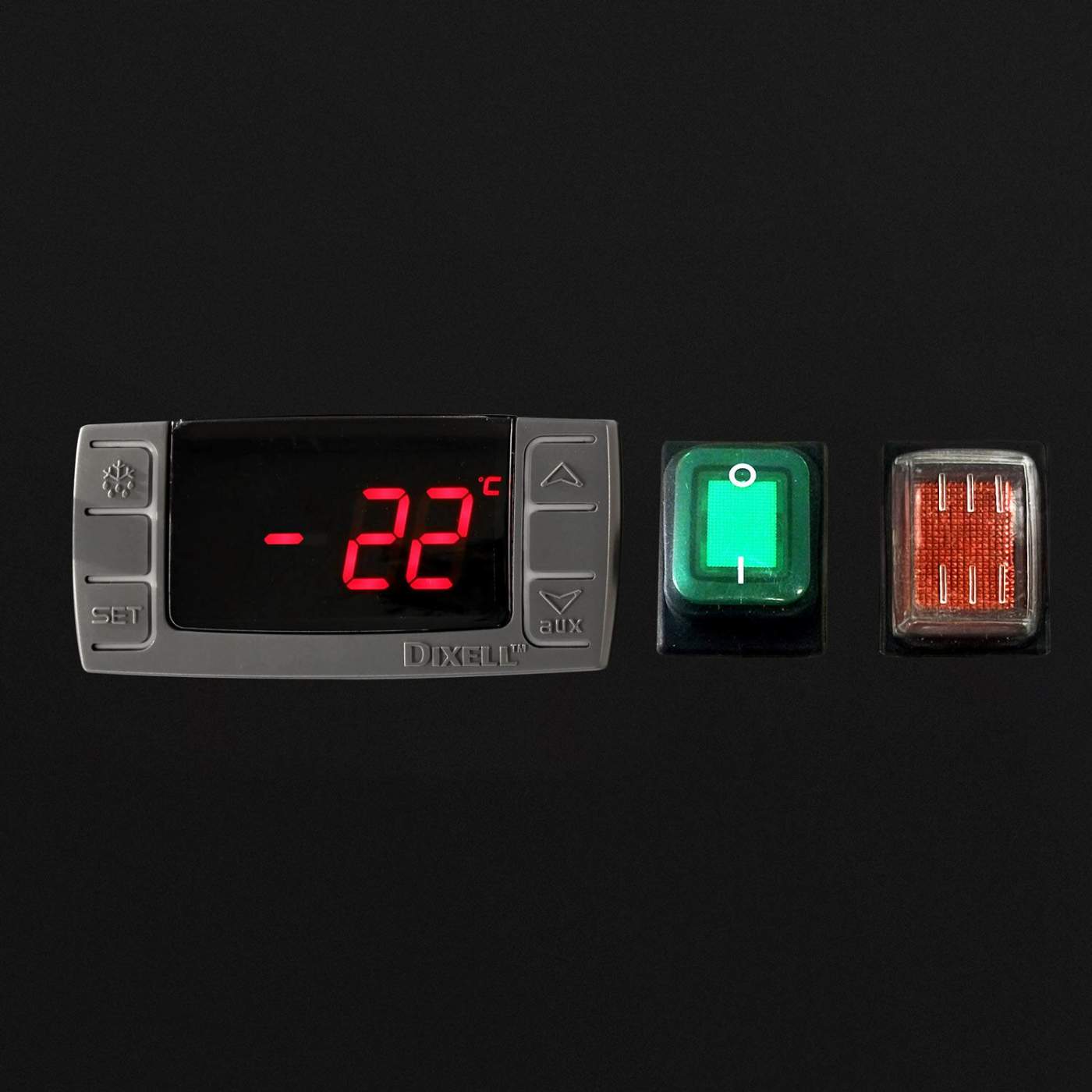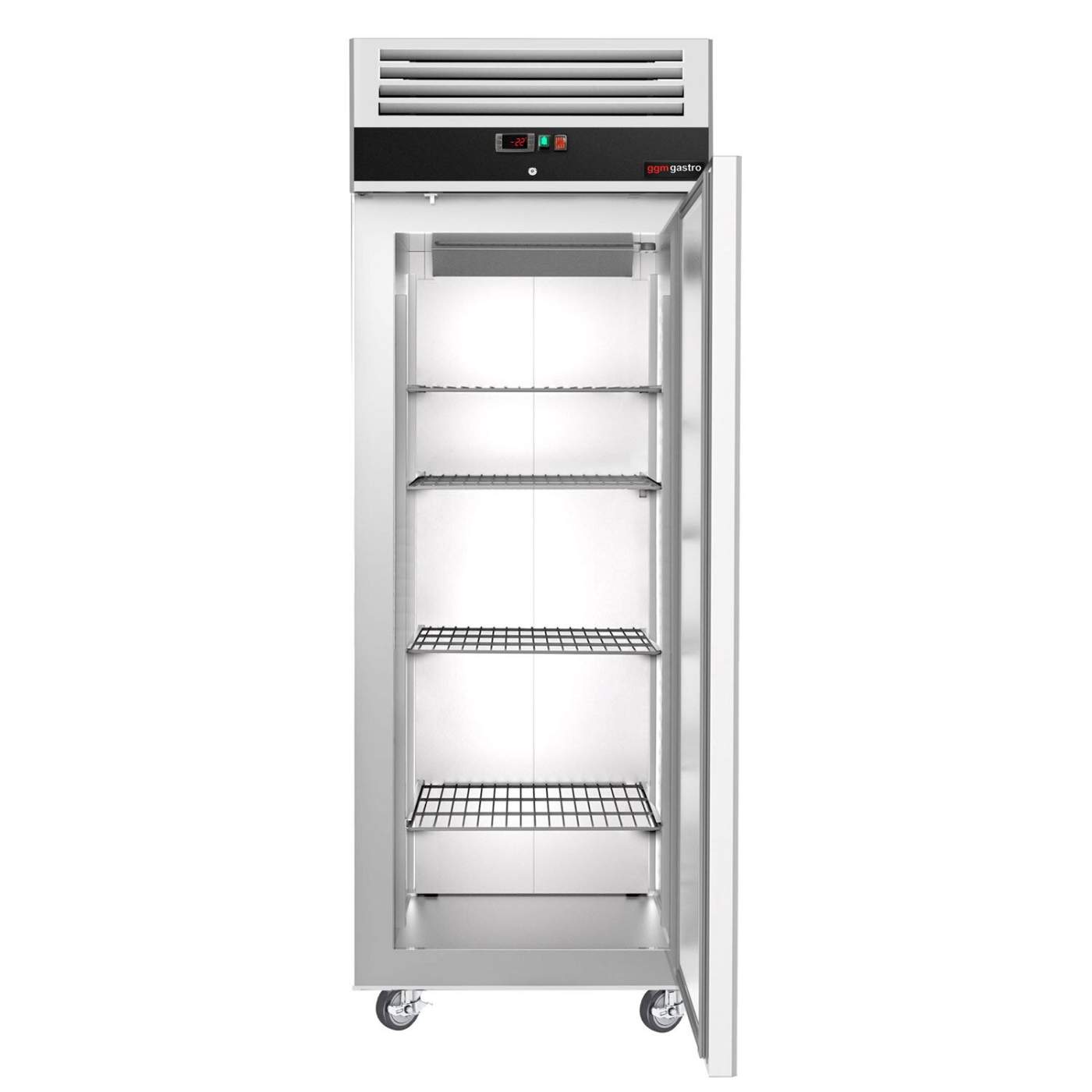 Этот морозильник объемом 700 литров разработан для интенсивного и эффективного замораживания продуктов. Он оснащен мощным двигателем и цифровым термостатом, которые обеспечивают надёжное охлаждение в диапазоне температур от -15°C до -22°C. Корпус и внутренние элементы выполнены из высококачественной нержавеющей стали AISI 430, что гарантирует долговечность и устойчивость к износу. Благодаря конвекционному охлаждению и режиму автоматической оттайки, морозильник обеспечивает равномерное и стабильное охлаждение. Встроенный дверной замок добавляет безопасность для хранения товаров.