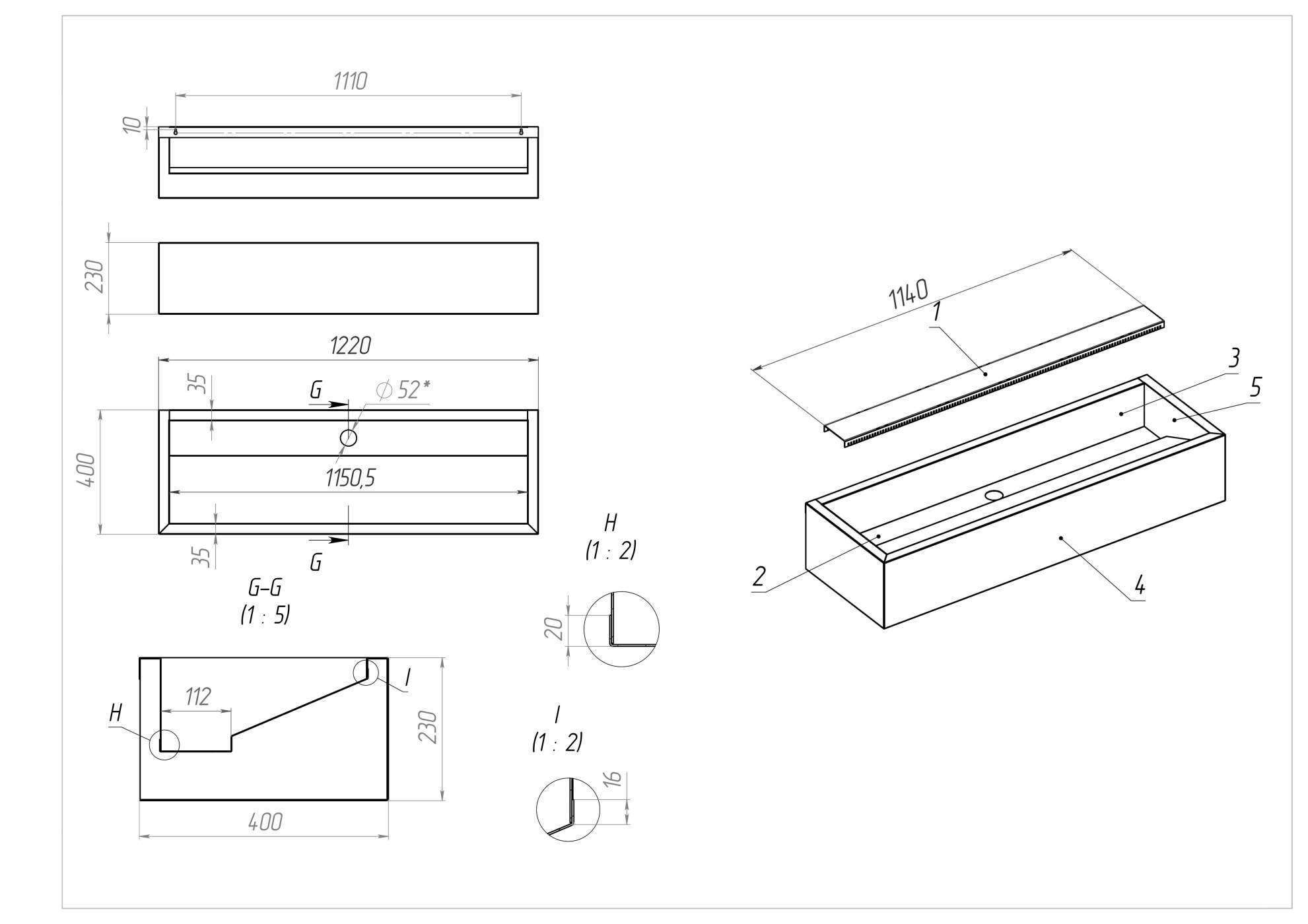 Рукомойник навесной с бортом 1400/600/225*200 (вмятина слева)