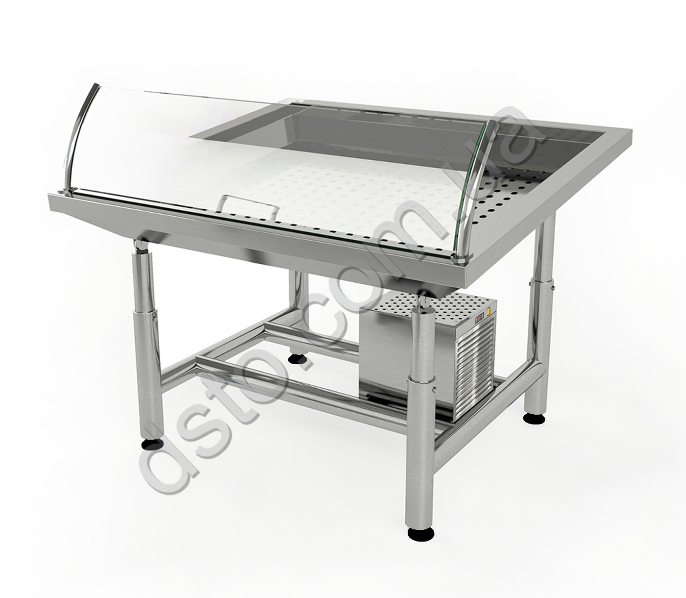 Витрина предназначена для поддержания в охлажденном состоянии рыбы, мяса, морепродуктов на льду. Мощный компрессор позволяет сохранять лёд в замороженном виде долгое время, а система слива легко отводит растаявший лёд в канализацию. Эргономичный угол наклона позволяет максимально эффективно использовать выкладку для продаж в супермаркетах, торговых центрах, магазинах. В стоимость витрины для выкладки рыбы не входит фронтальное стекло. Оно считается по запросу.
