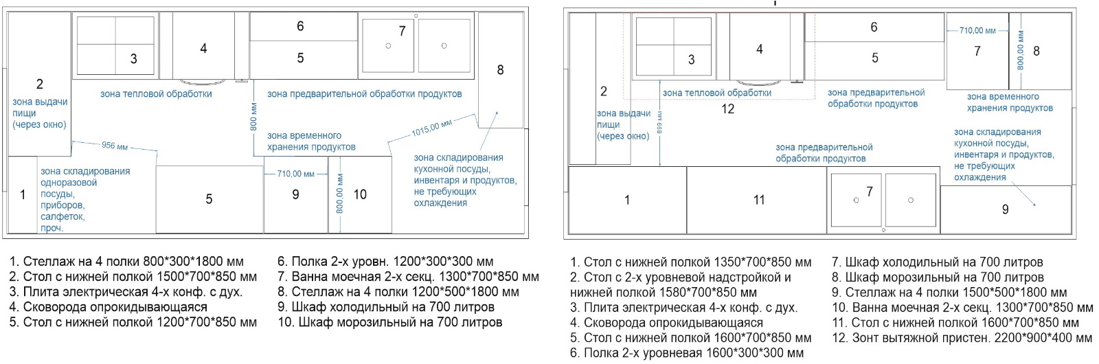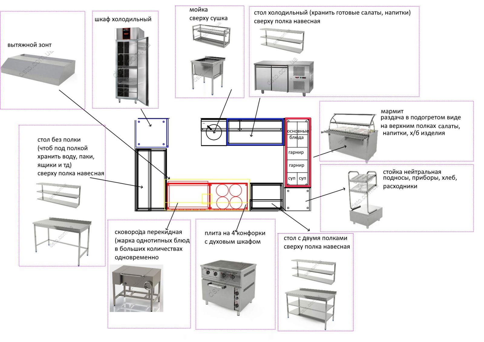 Отже, якщо вибір на користь пересувної кухні вами зроблено і визначено постачальника вагона-модуля, насамперед рекомендуємо продумати підведення комунікацій. Це, здавалося б, не наш список завдань, але вирішення питань постачання кухні електрикою, водою, теплом, свіжим повітрям, вікнами, зрештою, - перше, з чого треба почати. Тут ми точно не спеціалісти, але із суто практичного підходу важливим є мінімізувати наявність таких комунікацій безпосередньо на кухні. Тому, якщо сучасні рішення дозволяють так реалізувати завдання, не потрібно на цьому економити. Визначаємо корисний простір кухні. І далі слідуємо звичній логіці компонування цехів: сира продукція (зберігання, обробка) і видача готової продукції - максимально рознесені по приміщенню, наскільки це можливо. Біля входу швидше за все буде розміщено бак-накопичувач води та електрощиток. Ось десь у цій зоні, близькій до води та до чорного виходу, розміщуємо мийку, стелаж, холодильники для зберігання продуктів. Вагони мають прямокутну форму, тому основну робочу лінію розміщуємо вздовж однієї зі стін. На цій же стіні передбачаємо витяжну парасольку та вент. двигун до парасольки ззовні. Теплова лінія, як правило, складається з плити з духовкою на 4 конфорки і сковороди, що перекидається або, для кухонь з меншою продуктивністю, - з 6-ти конфоркової плити з духовкою. Робочі поверхні – це традиційно столи, в ідеалі з двома полицями та верхніми полицями-надбудовами. Для кухонь з розширеним бюджетом можна виробничий стіл замінити на холодильний, де зручно зберігатиме, наприклад, вже готові салати перед видачею.Видача може бути виконана у вигляді вікна роздачі, або повноцінною лінією роздачі, зі стійкою для приладів, мармітом з верхніми полицями, на яких розміщуємо салати, напої, випічку. З асортиментного ряду це все. А нюанси (розміри, комплектація елемента) – це вже індивідуальний вибір та потреба. Нижче кілька прикладів розміщення обладнання для модульної кухні-їдальні в модулі CN20. До речі, ми запрошуємо до співпраці виробників подібних вагончиків-кухонь та пересувних модулів. При спільному опрацюванні проекту наш з вами клієнт отримає абсолютно оптимальний варіант своєї кухні.