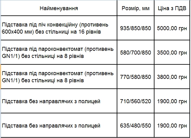 Підставки під пароконвектомат - це допоміжне обладнання, що забезпечує ефективну і безпечну експлуатацію конвекційних печей і пароконвектоматов. Конструкція підставок складається з зварних нержавіючих труб квадратного перетину марки AISI 430, здатна витримувати велику вагу теплового обладнання. Існують моделі зі стільницею і без стільниці, якщо вона є, то виготовляється з нержавіючої сталі марки AISI 304. Більшість моделей під стільницею мають ряд напрямних для зручного зберігання використовуваних гастроємностей / дек різного формату та розміру (за бажанням клієнта можливе виготовлення напрямних під деко будь-якого розміру ).
