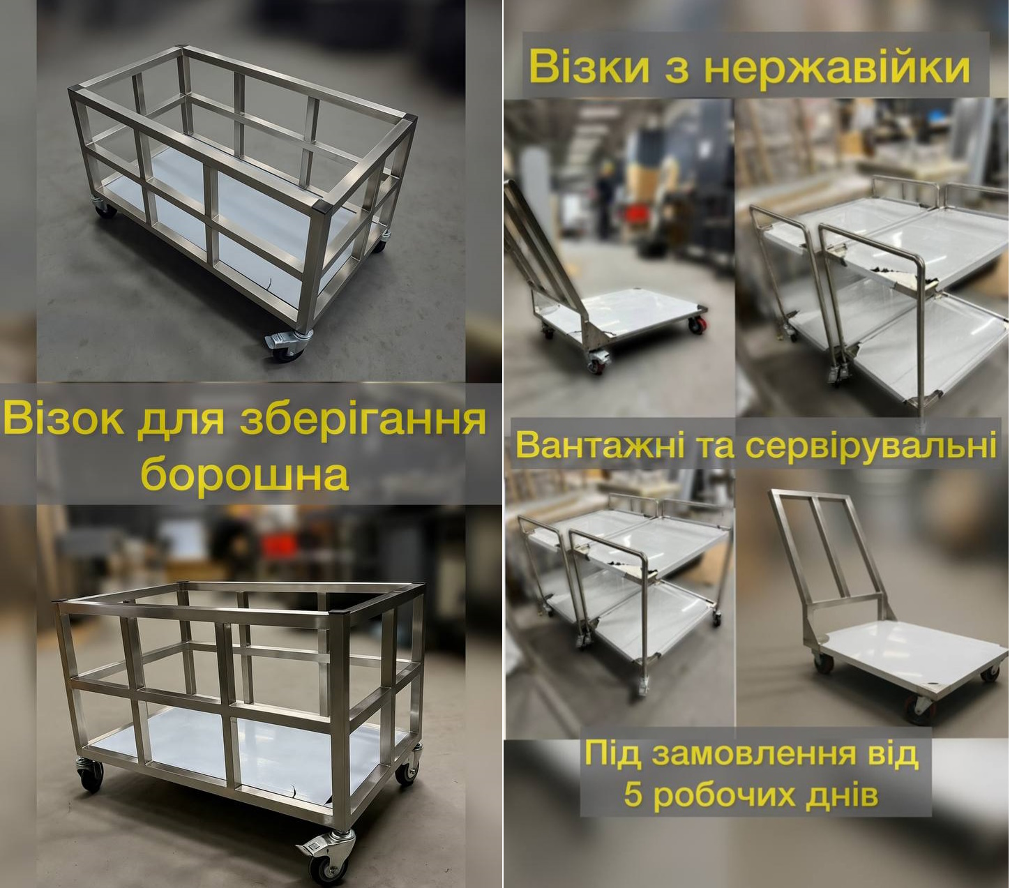 Розширення виробництва дало можливість виконувати типові вироби, такі як візки, в найкоротші терміни. Безсумнівною підмогою на будь-якому підприємстві є ця група товарів. Багатофункціональні, візки задіяні і в залі прийому їжі, і на кухні, і в складі. Вони можуть бути виконані як в класичному їх виконанні, так і з урахуванням ваших побажань. Вантажні, сервірувальні, складського зберігання - як завжди широкий асортимент за мінімальними цінами і тепер і в найкоротші терміни.