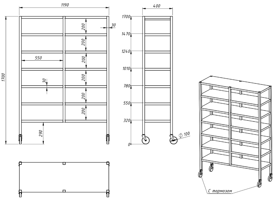 • каркас стелажу виконано з н/ж сталі AISI430, полиці з оцинкованної сталі