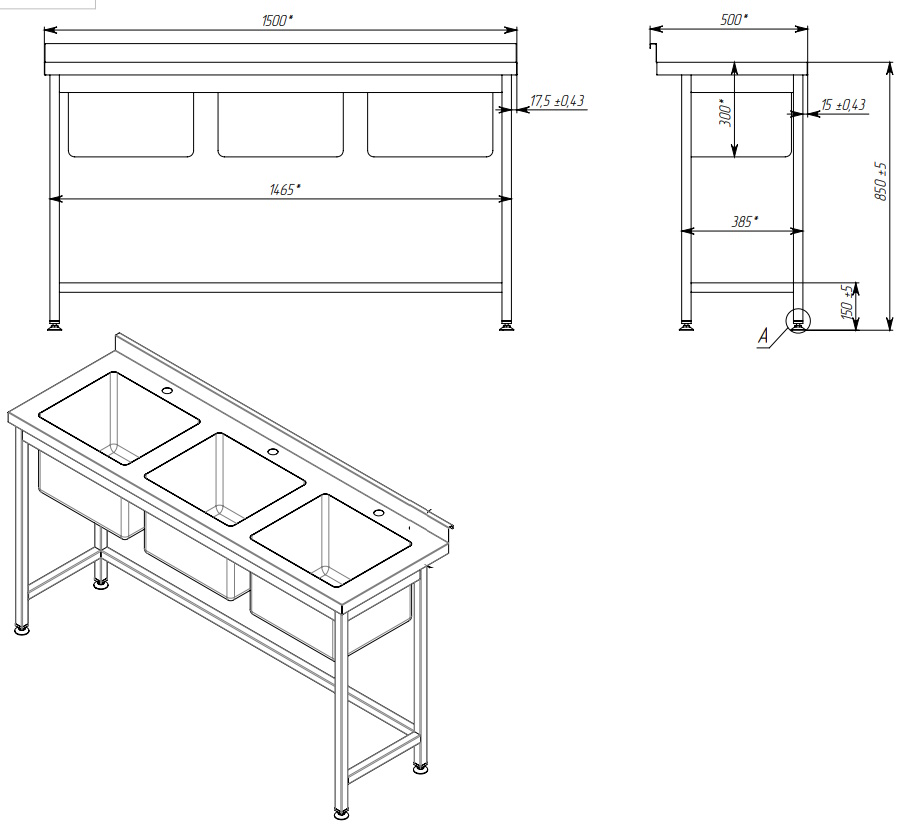 Мийка зварна 3-х секційна 1500х500х850 Техма